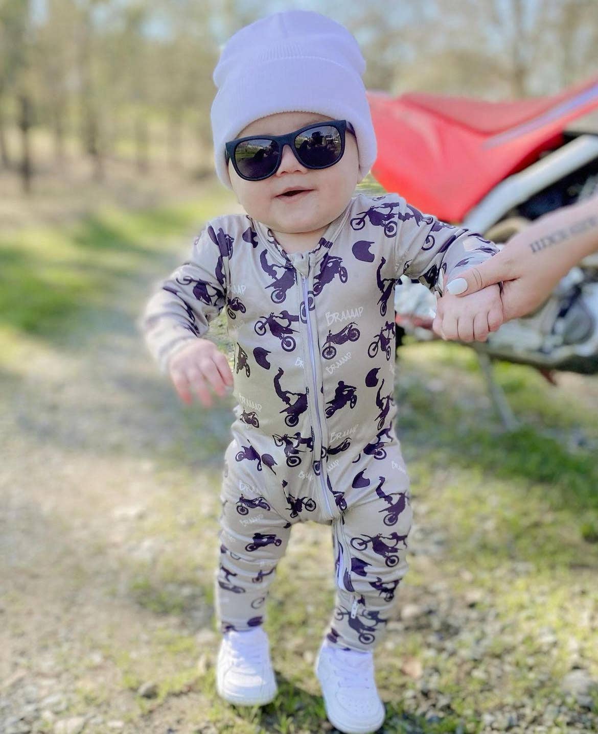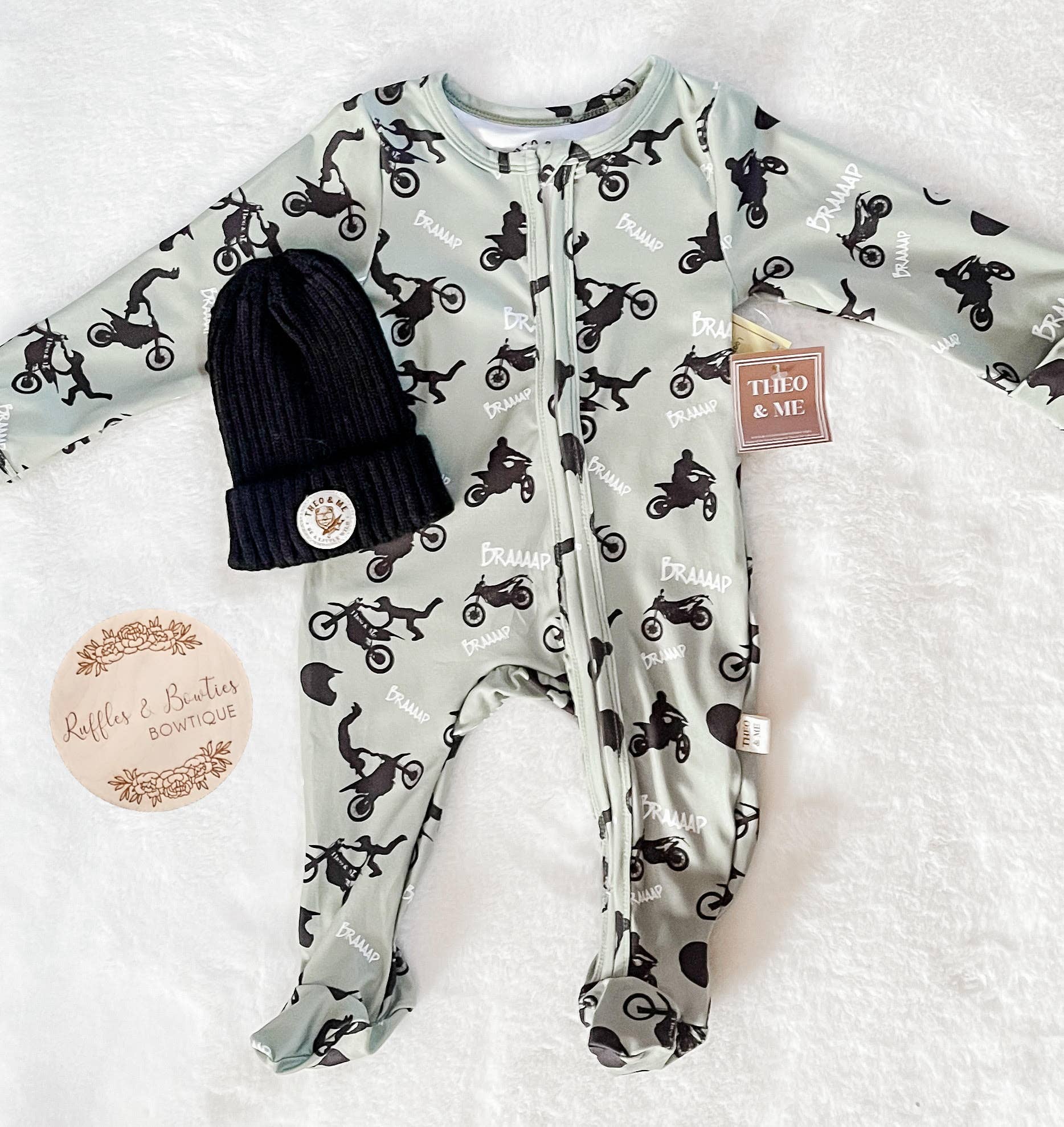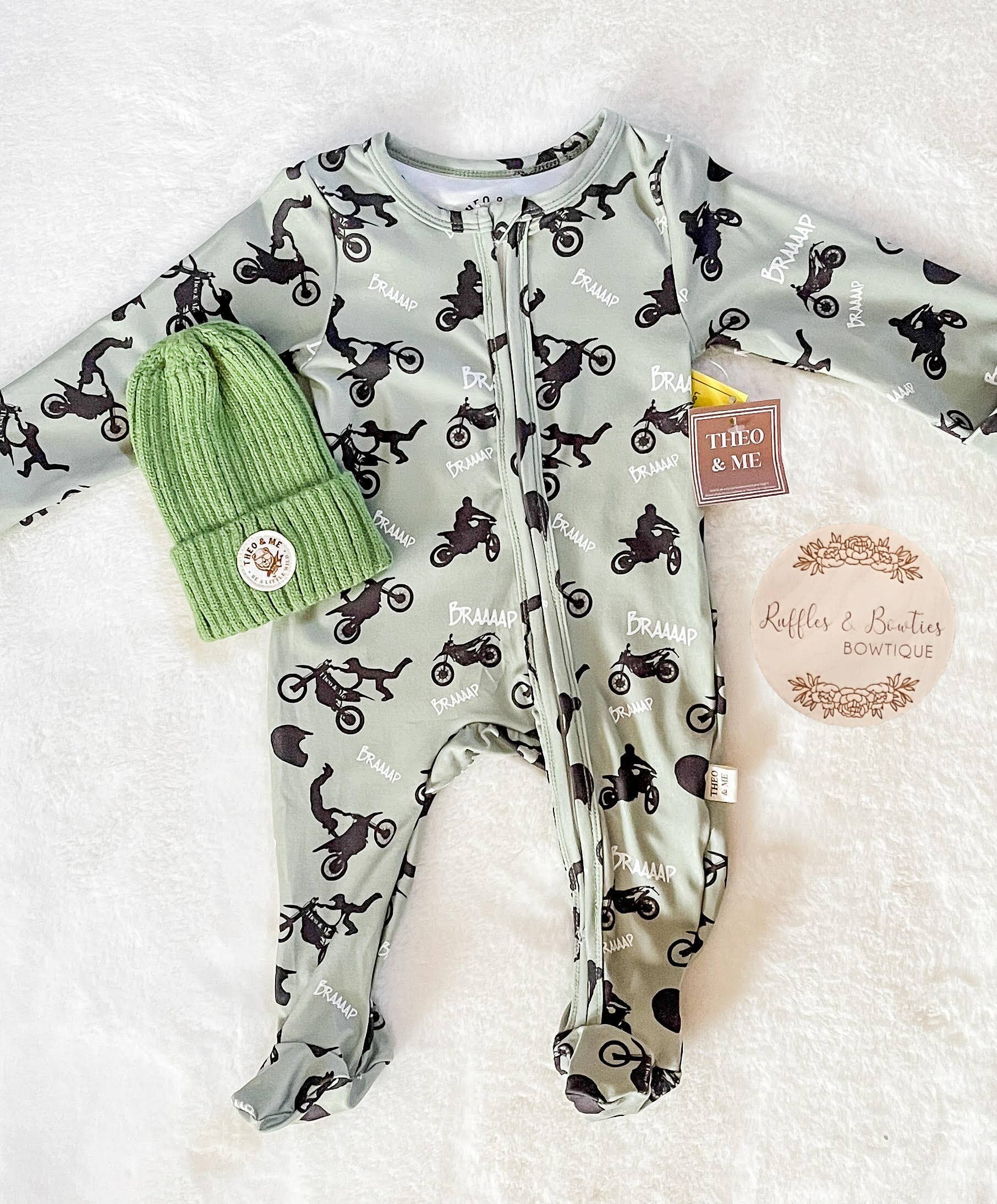 BRAND -Theo & Me PLEASE NOTE: This Sleeper is a green color, it is not grey. Start the day by using it as a jumpsuit then undo the fold-away mitts and feet and turn it into a sleeper for the night. Our double zipper feature on infant sleepers and rompers makes middle-of-the-night and out-and-about diaper changes a breeze. Care Instructions: Machine wash cold with like color Sizes 0 - 6 Months have feet Sizes 6 - 24 Months have convertible feet